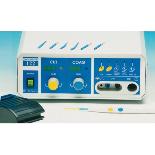| Datos Técnicos | - Alimentación: 115/230v 50/60Hz. - Potencia: Corte 120W/250ohm, coagulación 60W/200ohm, mixto 90W/150ohm, micro 16W. - Ciclo: 10seg/25seg. - Frecuencia: 600Khz +/-10%. |