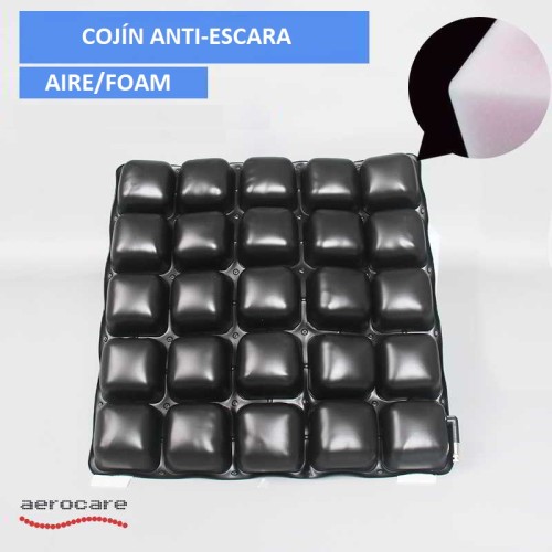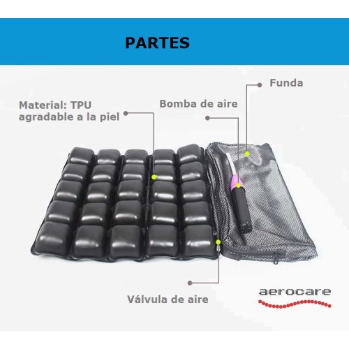 Medidas: 42x42x4.5cm, 25 celdas de aire. Foam incluido en cada celda, válvula de aire, Diseño único las celdas, conectadas como un todo para una mejor distribución del aire. Material: TPU agradable para la piel. Bomba de hinchado. Cubierta de calidad. |
